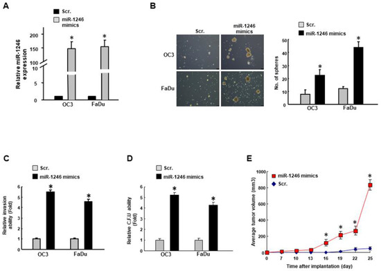 Upregulation of miR-1246 enhances the stemness phenotypes in OSCC. (A) Cells were transfected with miR-1246 mimics or scramble control (Scr.) followed by an examination of the relative expression of miR-1246; (B) Self-renewal (100×), (C) invasion, (D) colony-forming capacities were assessed. (E) Subcutaneous xenograft in mice was carried out to assess the in vivo tumorigenicity. Experiments were repeated three times and representative results were shown. Results are means ± SD of triplicate samples from three experiments. * p < 0.05.