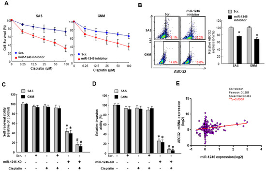 Downregulated miR-1246 increases the chemosensitivity of OSCC. (A) Cell survival following cisplatin treatment was determined by MTT assay; (B) The expression of drug resistance marker, ABCG2, was evaluated by flow cytometry; (C) Self-renewal and (D) invasion were examined following knockdown of miR-1246 with or without cisplatin; (E) The relationship between miR-1246 and ABCG2 was assessed by Pearson’s correlation. * p < 0.05.
