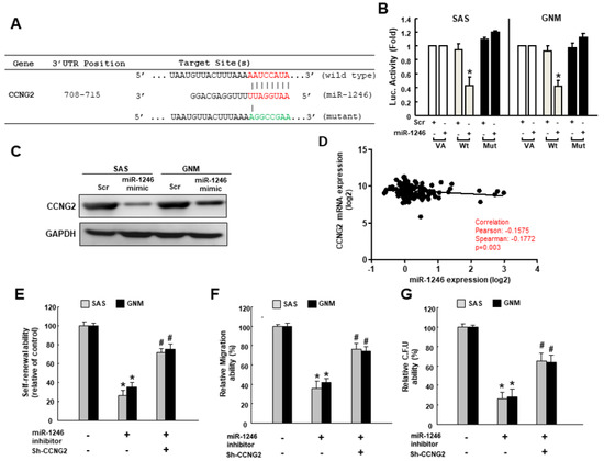 Suppression of CCNG2 by miR-1246 contributes to oral cancer stemness. (A) Schematic presentation of the constructed CCGN2 3′UTR reporter plasmids. Wild-type and mutated (Mut) CCNG2 reporter plasmids were co-transfected with miR-1246 or empty vectors; (B) The luciferase activity of each combination was assessed and showed that only WT reporter activity was inhibited by miR-1246; (C) CCNG2 protein expression in OSCC lines was examined by western blotting; (D) The relationship between miR-1246 and CCNG2 expression was shown; (E) Self-renewal, (F) migration, (G) colony-formation capacities of cells transfected with miR-1246 inhibitor with or without silence of CCNG2 were evaluated. * p < 0.05 compared with control group; # p < 0.05 compared with miR-1246 inhibitor only group.
