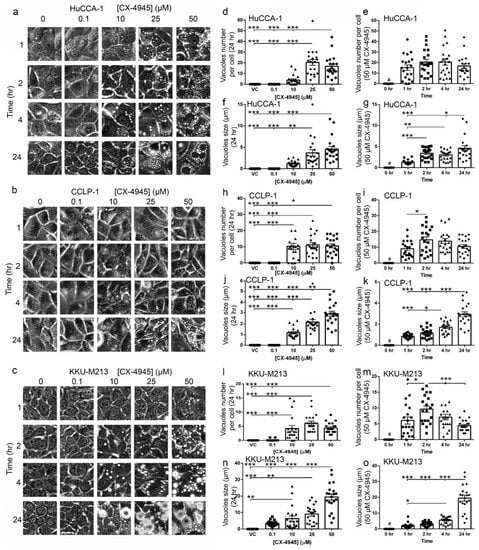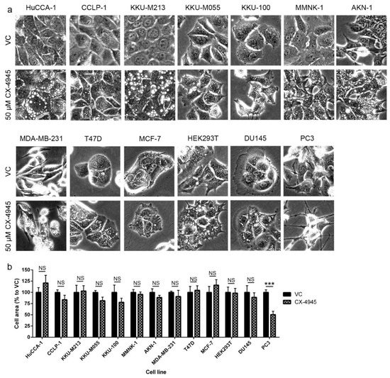Prominent vacuoles were observed as soon as 1 h after CX-4945 treatment in all CCA cell lines tested (Figure 2a–c). The number of the vacuoles at 24 h post-treatment increased in a dose-dependent manner in CX-4945 treated HuCCA-1, CCLP-1, and KKU-M213 cells (Figure 2d,h,l). The number of vacuoles also increased in a time-dependent manner until 4 h post-treatment in HuCCA-1 (Figure 2e) or 2 h after treatment in CCLP-1 and KKU-M213 (Figure 2i,m) before declining at later time points. This reduction in vacuole number might be due to the fusion of small vacuoles into larger ones. In keeping with this view, the size of the vacuoles increased in a dose- and time-dependent manner (Figure 2f,g,j,k,n,o). The vacuoles filled most of the cytoplasm at 24 h after treatment in cells treated with 50 µM CX-4945 (Figure 2a–c). To determine whether vacuole formation is limited to CCA cells, we next treated a variety of other CCA cells and non-CAA cells with CX-4945. CX-4945 treatment induced vacuole formation in all of the additional CCA cell lines tested (Figure 3a). Furthermore, 50 µM CX-4945 treatment at 4 h also induced intensive vacuolization in immortalized cholangiocytes (MMNK-1 and AKN-1 cells), as well as breast cancer cell lines (MDA-MB-231 and T47D), prostate cancer cell line DU145, and human embryonic kidney cells (HEK293T). However, one prostate cancer cell line (PC3) did not form vacuoles at all under the conditions tested, and one breast cancer cell line (MCF-7) formed only a few vacuoles in some cells (Figure 3a). Interestingly, although the cell area of the cell lines that form vacuoles did not decrease (Figure 3b), PC3 cell area decreased approximately 50% as compared to the vehicle control group (Figure 3b).