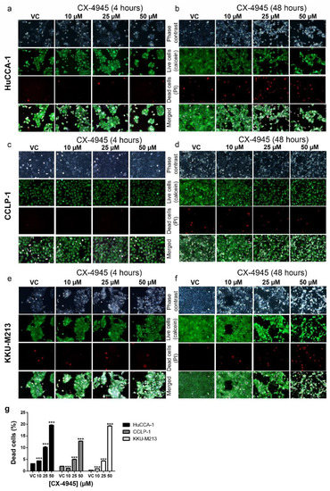 CX-4945 induced cell death. Propidium iodide staining showed that treatment with CX-4945 for 4 h did not induce cell death in (a) HuCCA-1, (c) CCLP-1, and (e) KKU-M213 cells. Extended CX-4945 treatment at 48 h, however, induced extensive cell death in (b) HuCCA-1 and (f) KKU-M213 cell lines. (d) Dead cell number was not increased in CCLP-1 treated with CX-4945 but live cell number clearly decreased in the 25 and 50 µM CX-4945 treated samples as well as in (b) HuCCA-1 and (f) KKU-M213 cell lines. (g) Percentage of dead cell increased in a dose-dependent manner in all three CCA cell lines. ***; p < 0.001, Pictures are representative of the results from three independent experiments.
