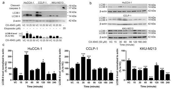 To determine whether vacuolization was accompanied by increased cell death, we treated CCA cells with CX-4945 and stained live cells with calcein and dead cells with propidium iodide. No significant increase in the number of dead cells was observed after 4 h of CX-4945 treatment (Figure 4a,c,e), which was the time point where a decreased level of CK2 activity was observed with CX-4945 treatment (Figure 1a). However, CX-4945 at 25 and 50 µM significantly induced cell death in HuCCA-1 cells (Figure 4b) and KKU-M213 cells (Figure 4f) at 48 h post-treatment. Although there was no significant increase in the number of dead CCLP-1 cells following treatment with CX-4945, the total number of cells 48 h post-treatment was clearly reduced (Figure 4d, calcein panels). This was also seen in the other cell lines (Figure 4b,f). The percentage of dead cells was increased in a dose-dependent manner from approximately 1–3% in the vehicle control group to 12% (CCLP-1) or 20% (HuCCA-1 and KKU-M213) in 50 µM treated group (Figure 4g). Interestingly, the number of apoptotic cells did not increase in these cells after treatment with CX-4945 at any concentration for 48 h (Figure 5a), while cell death was detected at 48 h post-treatment. Etoposide treated KKU-M213 cells were used as positive control for the cleaved caspase-3 apoptosis assay. Furthermore, the vacuoles that presented after CX-4945 treatment do not appear to be autophagosomes since levels of the autophagosomal marker LC3B-II decreased (Figure 5a) while the number and size of the vacuoles increased (Figure 2). Although HuCCA-1 treated with 10 and 25 µM CX-4945 showed an increased level of LC3B-II, the cells treated with 50 µM, which is the concentration where the highest number of vacuoles was observed, showed a decreased level of LC3B-II. Moreover, a decreased level of LC3B-II was observed in both CCLP-1 and KKU-M213 treated with CX-4945 (Figure 5a). To further examine the involvement of LC3B-II in the vacuolization induced by CX-4945, a time-course treatment of 50 µM CX-4945 was performed. The level of LC3B-II was elevated at early time points post-treatment in HuCCA-1 and CCLP-1 cells, but it decreased significantly at 4 h post-treatment. A similar trend was observed in KKU-M213 cells where the level of LC3B-II at earlier time points was higher than that at 4 h (Figure 5b,c). We conclude that CX-4945 is likely to induce non-canonical cell death in these cell lines. However, the LC3B-II protein might be involved in the initiation of vacuole formation.