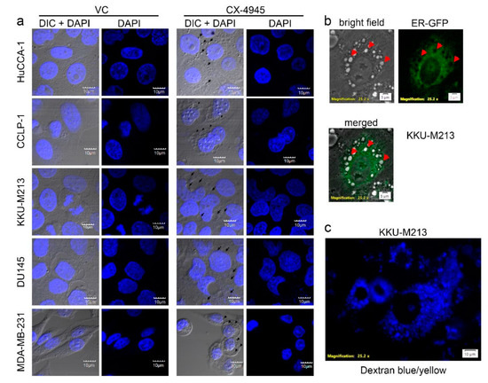 All cell lines used in these studies, except PC3 cells which did not form vacuoles (Figure 3a), showed no change in cell area (Figure 3b) and had no membrane blebbing (Figure 3a). Although their cytoplasm was filled with vacuoles, the cell membrane was well-spread and cell shape was normal as compared to the vehicle control group (Figure 3a). To further identify the cell death mechanism induced by CX-4945 in CCA cell lines, the nucleus and ER of cells treated with CX-4945 were examined. First, nuclear staining with DAPI showed that the nucleus of cells treated with 25 µM CX-4945 for 24 h were still intact. No chromatin condensation or nuclear fragmentation was observed (Figure 6a). Second, KKU-M213, which are cells that are most sensitive to CX-4945 in terms of vacuole formation, were incubated for 72 h with CellLight® ER-GFP BacMam 2.0 (C10590, Fisher Scientific, Hampton, NH, USA). This reagent transfected and expressed GFP-fused ER signal sequence, calreticulin, and KDEL, in live cells, thereby labeled ER with GFP. The ER of KKU-M213 treated with CX-4945 covered a large part of cytoplasm but did not overlap with the vacuoles (Figure 6b). Some large vacuoles reside near the nucleus and, therefore, share a similar space as the ER in the cytoplasm, however, many other medium and small vacuoles as well as some other large vacuoles were observed in the area not overlapping with the ER (Figure 6b). In addition, dextran blue/yellow was added in the culture media during CX-4945 treatment to track the endocytosis process. KKU-M213 engulfed dextran blue/yellow into the vacuoles, which showed as blue dots of various sizes in the cytoplasm (Figure 6c). Dextran blue/yellow remained blue indicating that pH of the vacuoles was neutral since it changes to green or yellow when the environment is acidic. We conclude that the vacuoles formed from CX-4945 treatment did not alter nuclear and membrane integrity. Furthermore, vacuoles in KKU-M213 are not formed from the ER, instead they are formed from the endocytosis process as their pH is neutral. These finding meet the criteria for methuosis.