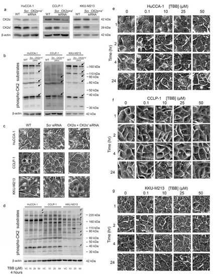 To determine whether the effects of CX-4945 on vacuole formation were mediated by the inhibition of CK2, we next knocked down the expression of the α and α′ CK2 catalytic subunits using specific siRNAs (Figure 7a). Knockdown of both CK2 α and α′ in the HuCCA-1, CCLP-1, and KKU-M213 CCA cell lines was verified using Western blotting (Figure 6a). In all three cell lines, knockdown of CK2 α and CK2 α′ decreased the levels of multiple phospho-CK2 substrates (Figure 7b). A reduction in phospho-CK2 substrate levels was observed for proteins with apparent molecular masses of 180, 110, 60, and 37 kDa as indicated by arrows in the Figure (Figure 7b). However, CK2 α and CK2 α′ knockdown failed to induce vacuolization in any of the CCA cell lines (Figure 7c). To confirm these results, we next treated CCA cell lines with 4,5,6,7-Tetrabromobenzotriazole (TBB), a well-characterized inhibitor of CK2 activity. Treatment with TBB did not induce the formation of vacuoles in any of the three CCA cells lines (Figure 7e–g) although it did block the phosphorylation of multiple CK2 substrates in HuCCA-1 and KKU-M213 cell lines (Figure 7d). We conclude that the induction of vacuoles by CX-4945, at least in HuCCA-1 and KKU-M213 cells, is not mediated by the inhibition of CK2 activity.