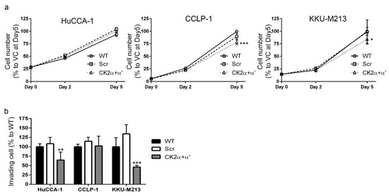 CK2 knockdown had little effect on CCA cell proliferation but inhibited cell invasion. (a) Knockdown of α and α′ catalytic subunits of protein kinase CK2 (Figure 7a) decreased CCLP-1 and KKU-M213 cell number as determined using MTT assays. (b) Knockdown of α and α′ catalytic subunits of protein kinase CK2 reduced HuCCA-1 and KKU-M213 cell invasion. WT; wild type, Scr; scramble siRNA, *; p < 0.05, **; p < 0.01, ***; p < 0.001. All experiments were performed as at least three biological replicates. Graphs were plotted as mean ± SEM.
