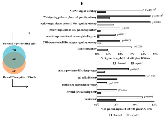 Gene ontology (GO) analysis of genes upregulated (A) and downregulated (B) in either EBV-positive or EBV-negative HRS cells. Gene lists were derived from our reanalysis of genes differentially expressed in either EBV-positive or EBV-negative HRS cells compared to microdissected normal GC. Gene set enrichement was performed using DAVID 6.8 (Frederick, MD, USA) [99,100].