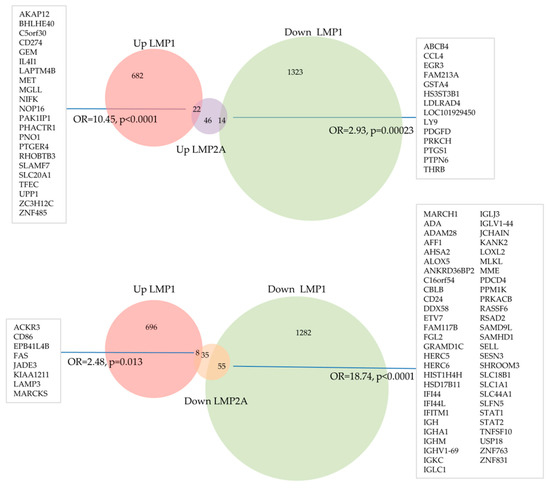 We have previously used the transfection of primary human GC B cells to study the impact of the EBV latent genes on the cellular transcriptome of these cells [74,87,98]. A re-analysis of our previous microarray datasets has revealed that 704 unique genes were up-regulated and 1337 unique genes were down-regulated following LMP1 expression in primary human GC B cells. 82 genes were up-regulated and 98 genes were down-regulated by LMP2A in the same cell background. Of these, 22 and 55 genes were also up- and down- regulated, respectively, by LMP1. This represents a highly significant overlap (odds ratio (OR) = 10.45, p < 0.0001, and OR = 18.74, p < 0.0001, respectively; Figure 2) which could explain some of the synergistic/additive effects of LMP1 and LMP2A observed in mouse B cells described above. In particular, we found a striking overlap of genes down-regulated by both LMP1 and LMP2A that are involved in the regulation of host immune responses, including for example, key components of type I interferon responses such as STAT1, STAT2, IFITM1, and IFI44L (Figure 3). This presumably underscores the importance to the virus in disabling this key anti-viral defense pathway. However, we also found that genes up-regulated by LMP1 were significantly enriched among genes down-regulated by LMP2A in GC B cells (OR = 2.48, p = 0.013). Moreover, genes down-regulated by LMP1 were significantly enriched among genes up-regulated by LMP2A (OR = 2.93, p = 0.00023). Genes regulated in opposite directions included CD86 and FAS which were up-regulated by LMP1 but down-regulated by LMP2A. This could be relevant because it has been observed that cross-linking of CD80 and CD86 in EBV-infected lymphoblastoid cell lines results in apoptosis [115]. This effect was a consequence of the induction of FAS and FASL expression by CD80 and CD86 stimulation. Therefore, LMP2A could be important for counteracting the potentially apoptotic effects of EBV infection of B cells.
