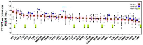 Here, for instance, we measured RKIP mRNA expression across 37 different cancer types, using data from The Cancer Genome Atlas (TCGA) platform (https://cancergenome.nih.gov/), corroborating its downregulation in the majority of them compared to the normal tissues. Our analysis shows that RKIP exhibits its highest levels in adrenocortical carcinoma (ACC), liver hepatocellular carcinoma (LIHC), and thyroid carcinoma (THCA), and its lowest expression was detected in acute myeloid leukemia (LAML), esophageal carcinoma (ESCA), and stomach and esophageal carcinomas (STES) (Figure 1).