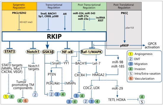 Schematic representation of the upstream regulators of RKIP expression (up) and the direct and indirect downstream RKIP targets involved in the regulation of metastasis initiation (down). Solid lines indicate the physiological function of each protein on the expression of downstream targets, while the dotted lines show the downstream effect(s) of the indicated protein after alteration of its levels by RKIP. Abbreviations: TM, Tumor microenvironment; EMT, Epithelial-to-Mesenchymal Transition; MMPs, Matrix Metalloproteinases; AR, Androgen Receptor; pRKIP, phosphorylated RKIP; PRC2, Polycomb Repressing Complex 2; EZH2, Enhancer of Zeste Homolog 2.