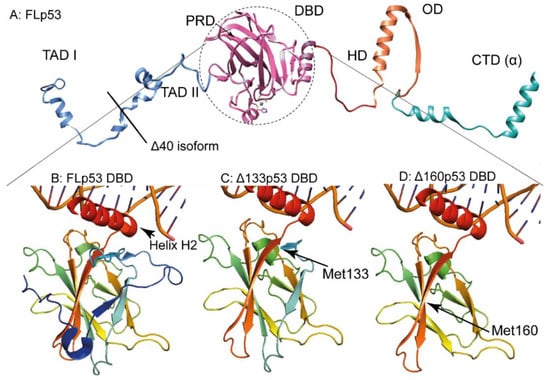 The ∆40p53 isoform starts from the 40th codon of the TP53 gene. Compared to all other N-terminal p53 variants, the ∆40p53 isoform bears the shortest truncation. Hence, it maintains most of the functions of the FLp53 (Figure 2A). As mentioned before, ∆40p53 can be translated by alternative splicing of the p53 transcript, when intron-2 is retained (Figure 1). This intron carries an in-frame stop codon, which causes termination of translation forming a very short peptide. An IRES exists following the stop codon, which allows re-initiation of translation at codon 40, which, being ATG, codes for methionine. Compared to the FLp53, this isoform lacks TAD I, but retains TAD II (Figure 2A). ∆40p53 can oligomerize with FLp53 in vivo and thereby regulate the function of FLp53 []. Moreover, because it retains only TAD II, ∆40p53 is capable of inducing a different set of p53-responsive genes than FLp53 []. It can induce many apoptosis-associated genes which are inaccessible by FLp53 []. In addition, ∆40p53α forms oligomers with a higher propensity than FLp53 [] and small amounts of ∆40p53 can increase the transactivation effect of FLp53 []. Conversely, high ∆40p53 levels induce a different set of genes than the FLp53 []. The strong tendency of ∆40p53 to form oligomers demonstrates that small amounts of ∆40p53 can have a substantial effect on the p53 pathway []. In essence, ∆40p53 balances tissue regeneration and tumor suppression [] while fine-tuning the p53 activity [].