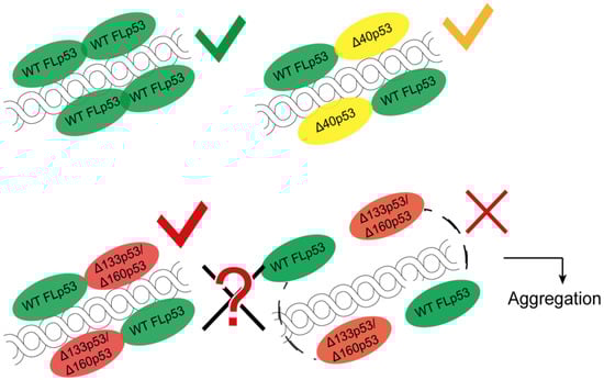 As discussed before, the gene encoding p53, TP53, can translate 12 different isoforms by alternative promoter usage, alternative splicing and by the presence of multiple IRES [,]. These isoforms have varying N- and C-termini and show different effects on p53 function. The ∆40p53 isoform is similar to the FLp53 and causes no inhibitory action leading to apoptosis (Figure 4) [,]. On the contrary, ∆133p53 and ∆160p53 act more like a survival factor [,,] and could lead to a more resistant cancer []. It is unclear whether these two isoforms with truncated DBD are capable of binding to the specific DNA sequences. However, owing to the arginine/lysine-rich CTD, these isoforms may bind to DNA non-specifically. It is also not known whether these isoforms can activate gene expression by forming usual tetramers. Due to the intact OD, they can potentially form tetramers with themselves and also with FLp53, thereby inhibiting the regular p53 pathway (Figure 4). ∆160p53 has even been found as responsible for a gain of function which is usually exhibited by mutant p53s [].