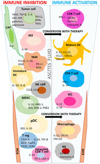 Macrophages and monocytes in the ovarian tumor may exhibit polarization to an M2, protumor, and immunosuppressive state, under the influence of colony-stimulating factor (CSF), IL-4, IL-13, IL-10, TGF-β and other soluble molecules. M2 (alternatively activated) macrophages secrete IL-10 and TGF-β and play an active role in tissue remodeling and tumor progression [77,78].