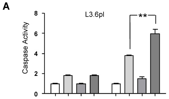 hTERT-HPNE, Panc1, and L3.6pl cells were seeded onto white-walled, clear-bottomed, 96 well plates (2,000 cells/well) and left to attach overnight. Media was then removed and media containing 0 or 10 µM CONPs was added. 24 h later, cells were exposed to 0 or 5 Gy radiation. At 24–48 h post radiation, caspase 3/7 activation was determined via Caspase-Glo® 3/7 Assay (Promega, Madison, WI, USA) following the manufacturer’s protocol. Caspase activity was normalized to cell viability, which was determined with CellTiter-Glo®; Luminescent Cell Viability Assay (Promega). Data was normalized to control (untreated) caspase levels for graphing. Cell viability was determined using WST-1 assay as previously reported [35,37].