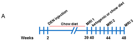 Magnetic resonance imaging analyses of diethylnitrosamine-injected mice fed chow and ketogenic diets. (A) Schematic overview of the experimental study. (B) Representative serial images of a mouse liver from the chow-fed control group at each MRI timepoint.