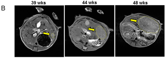 MRI scans were performed at weeks 39, 44, and 48 using a 7T Clinscan MR system (Bruker, Ettlingen, Germany). For radiofrequency (RF) transmission and reception, a birdcage RF coil was used that has a diameter of 35 mm. Heart rate, respiration, and core body temperature were monitored using a fiber optic, MR-compatible system (Small Animal Imaging Inc., Stony Brook, NY, USA). Anaesthesia was maintained using 1.25% isoflurane in O2 inhaled through a nose cone. After the mice were anesthetized, gadolinium (Gd) was administered (gadobenate dimeglumine injection, MultiHance, Bracco Diagnostics) in solution at 0.6 mmol/kg via intramuscular injection into the left quadricep. Mice were then held for 5 min for the tracer to circulate. Images were acquired with a T1-weighted, gadolinium-enhanced spin-echo pulse sequence. Imaging parameters were TR (repetition) = 797 ms, TE (echo) = 15 ms, 2 averages, matrix of 192 × 192 (zero-filled to 256 × 256), FatSat (strong mode), 21 slices with 100% gap. This was repeated with 21 adjacent slices to provide a contiguous set of 42 images. Raw DICOM files were sorted and renamed using DICOMSort and then images were imported into ImageJ Fiji to count liver tumors. Minimum detectable tumor size was 1.5 mm in diameter.