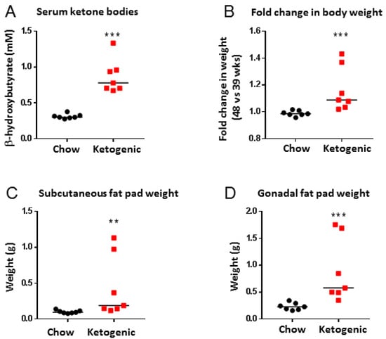 Sera analyses confirmed that β-hydroxybutyrate levels were significantly higher in mice fed a ketogenic diet compared to chow-fed mice, confirming that the diet induced ketosis (median levels of 0.2997 mM in the chow group vs. 0.7781 mM in the ketogenic group, p < 0.001, Figure 2A). Mice fed a ketogenic diet had a significant increase in body weight from week 39 to week 48, compared to chow-fed mice (median fold change chow group = 0.985 vs. median fold change ketogenic group = 1.088, p < 0.01, Figure 2B). Mice fed a ketogenic diet also had significant increases in subcutaneous fat (median weight of one fat pad was 0.095 g in chow-fed mice vs. 0.188 g for mice fed a ketogenic diet, p < 0.001) and gonadal fat (median fat pad weight of 0.228 g for chow diet vs. 0.578 g for ketogenic diet, p < 0.001) compared to chow-fed animals (Figure 2C,D).