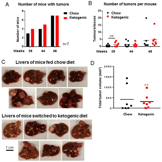 Mice fed a ketogenic diet were not protected from tumor progression. (A) Number of mice with tumors visible by MRI at each time point (n = 7). (B) Number of tumors visible by MRI in each mouse liver (n = 7, ns = not significant, p = 0.9664). (C) Images of livers from all mice, fed either a chow or ketogenic diet. (D) Total tumor burden per mouse at necropsy (n = 7, ns = not significant, p = 0.7087). Data analysed by two-way ANOVA with Sidak’s multiple comparisons test (alpha = 0.05) for B and unpaired Student’s t test for D. Scale bar is 1 cm.