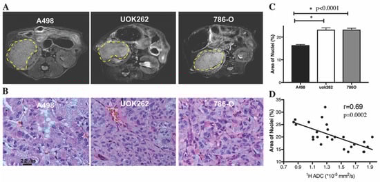 Orthotopic tumor on 1H MRI and histology. (A) Representative T2-weighted anatomic images of the tumors outlined by yellow dashed lines. (B) Representative H&E staining of the tumor sections shows qualitatively lower cellularity in the A-498 tumors (at 20× magnification). (C) Quantitative image analysis of the H&E sections confirms that the A-498 tumors have significantly lower mean % area covered by nuclei, a measure of cellularity, compared to the other tumors (p < 0.0001). The nuclei size is not significantly different among the three tumors. (D) The ADCs from 1H diffusion-weighted MRI are significantly inversely correlated to tumor cellularity (r = 0.69, p = 0.0002). * denotes statistically significant change (p < 0.05).