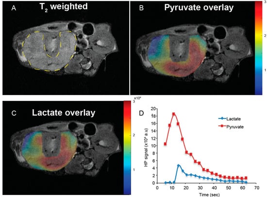 - Harris, T.; Eliyahu, G.; Frydman, L.; Degani, H. Kinetics of hyperpolarized 13C1-pyruvate transport and metabolism in living human breast cancer cells. Proc. Natl. Acad. Sci. USA 2009, 106, 18131–18136. [Google Scholar] [CrossRef] [PubMed]