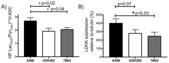 Figure 2 shows representative HP 13C pyruvate and 13C lactate images of tumors overlaid on T2-weighted anatomic images, and dynamic curves of HP 13C pyruvate and 13C lactate signal over time in an A-498 tumor. The 13C pyruvate signal peaks around 12 s following the start of the injection. Supplemental Figure S1 summarizes the 13C pyruvate dynamics for the tumors derived from the three different cell lines, showing a similar peak 13C pyruvate signal among the tumors, and a slightly longer duration of the 13C pyruvate signal in the A498 tumors. Supplemental Figure S2 shows representative images of HP 13C signal overlaid on T2-weighted anatomic images without tumor segmentation. Figure 3A shows 13C pyruvate-to-lactate conversion in A-498 (n = 8), UOK262 (n = 7), and 786-O (n = 8) tumors, represented by the 13C lactate area-under-the-curve/maximum pyruvate (13C LacAUC/Pyrmax), and normalized by the tumor 1H ADC to adjust for the differential cellularity of the tumors. Since the tumor 1H ADC is a surrogate for cell density (Figure 1D), the 13C pyruvate-to-lactate conversion in tumors with higher cellularity and corresponding lower 1H ADC is scaled to take into account the cellularity, thus permitting a more accurate comparison of relative 13C metabolism among the tumors. The tumor HP 13C LacAUC/Pyrmax ratios without the 1H ADC scaling are shown in Supplemental Figure S3. One-way ANOVA with post-hoc comparisons shows that the normalized 13C pyruvate-to-lactate conversion was significantly higher in the A-498 tumors (2.70 ± 0.25 × 10−3) compared to the UOK262 tumors (1.90 ± 0.23 × 10−3, p = 0.02) and 786-O tumors (2.05 ± 0.15 × 10−3, p = 0.04). The tumor LDHA expression (relative to β-actin) showed a similar trend with A-498 tumors having significantly higher LDHA expression than the 786-O tumors (400 ± 51% vs. 247 ± 47%, p = 0.033). The LDHA expression of A-498 was also higher than that of UOK262 tumors, with a p-value approaching significance (400 ± 51% vs. 280 ± 43%, p = 0.071) (Figure 3B).