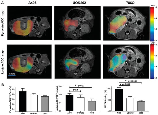 Diffusion-weighted HP 13C MRI to interrogate 13C lactate compartmentalization in orthotopic RCC tumors (A-498 (n = 8), UOK262 (n = 7), and 786-O (n = 8) tumors). (A) Representative 13C pyruvate and 13C lactate ADC maps of tumors from diffusion-weighted HP 13C MRI overlaid on the T2-weighted anatomic images. (B) The 13C lactate ADC values were significantly higher in the A-498 compared to the 786-O tumors (p = 0.03). The 13C lactate ADC values were also higher in the A-498 tumors compared to the UOK262 tumors, though the p-value did not reach statistical significance (p = 0.10). The 13C pyruvate ADC values were not significantly different between any of the tumors. MCT4 staining in the A-498 tumors was significantly higher compared to the UOK262 and 786-O tumors (p = 0.001, p = 0.0001, respectively). * denotes statistically significant change (p < 0.05).