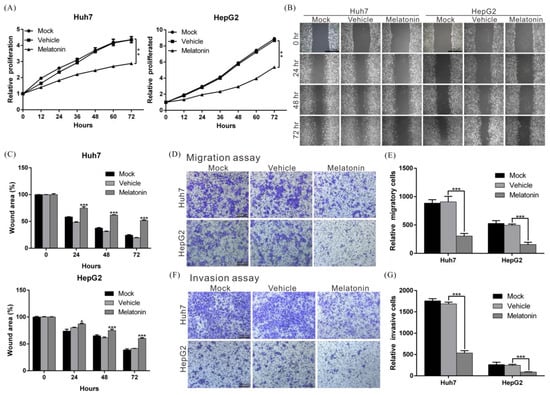 Melatonin suppressed proliferation, migration and invasion capacities in HCC cells. (A) Huh7 and HepG2 cells were treated with 1 mM melatonin, and cell proliferation capacity was assessed at the indicated time points using an xCELLigence real-time cell analyzer. Mock: cells treated with DMEM medium. Vehicle: cells treated with DMSO. p < 0.01 (**), as assessed using Student’s t-test. (B) Wound-healing abilities of Huh7 and HepG2 cells treated with/without 1 mM melatonin were compared. Quantification of the cell wound-healing assays is presented in (C). p < 0.05 (*), p < 0.001 (***). (D) The migration capacities of Huh7 and HepG2 cells treated with/without 1 mM melatonin were compared using a transwell assay. Quantitative cell migration assay results are shown in (E). Data represent the mean ± S.D. of three independent experiments. p < 0.001 (***). (F) Invasion capacities of Huh7 and HepG2 cells were measured using Matrigel-coated polyethylene terephthalate membrane inserts. Quantification of the cell invasion assay is shown in (G). p < 0.001 (***). All experiments were performed in triplicate.