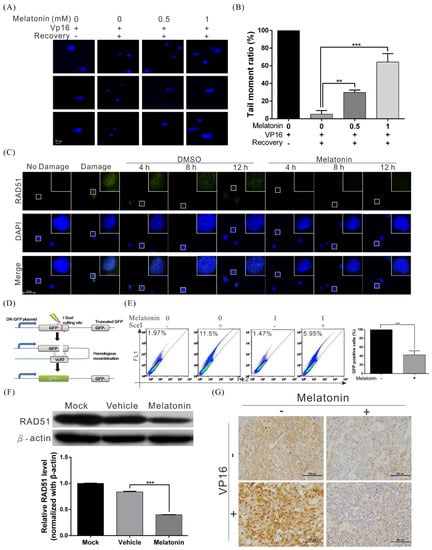 Melatonin suppressed the DNA repair capacity of HCC cells by inhibiting RAD51 expression. (A) A comet assay shows DNA repair activity after treatment with melatonin. Huh7 cells were treated with 200 µM etoposide (VP16) for 1 h, followed by treatment with different concentrations of melatonin in etoposide-free medium for 4 h. The cells were harvested and subjected to comet assays to detect DNA repair activity. The rows of panels present the results of three individual experiments. Quantification of cell repair activity is shown in (B). p < 0.01 (**), p < 0.001 (***). (C) Huh7 cells were treated with 200 μM etoposide (VP16) for 1 h to induce DNA damage, followed by recovery in medium with or without 1 mM melatonin. Cells were processed for immunofluorescence staining at various time points to detect the formation of Rad51 foci (green). Nuclei were stained with DAPI (blue). (D) A schematic representing the principle of the HR reporter assay. The DR-GFP system, which contains two mutated GFP genes (termed GFP−) was applied to detect HR repair in human cancer cells. As the left GFP- gene contains an I-SceI endonuclease site, expression of I-SceI leads to a DSB that can be repaired by HR using the homologous region in the truncated GFP gene. The complete HR results in expression of a functional GFP (GFP+) that can be detected by flow cytometry. (E) The results of flow cytometry indicate that melatonin significantly inhibited HR in HCC cells. (F) Western blot analysis of RAD51 in Huh7 cells treated with or without 1 mM melatonin for 48 h; β-actin was included as an internal control (upper panel). Quantitative results are shown in the lower panel. (G) Downregulation of RAD51 in mice xenografts treated with melatonin, as examined by immunohistochemistry.