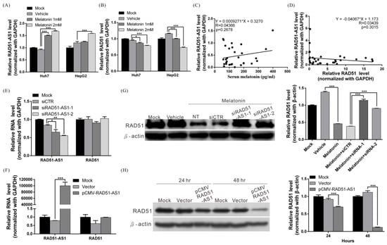 Melatonin induced expression of lncRNA RAD51-AS1, causing RAD51 downregulation. (A,B) Huh7 and HepG2 cells were treated with 1 mM melatonin for 48 h, and expression of RAD51-AS1 and RAD51 was examined by quantitative real-time RT-PCR. p < 0.001 (***) (C) Human serum melatonin levels and hepatic RAD51-AS1 levels were measured by ELISA and real-time RT-PCR, respectively (n = 33). RAD51-AS1 expression was positively correlated with serum melatonin levels. (D) RAD51-AS1 and RAD51 expression in human liver tissues was analyzed by real-time RT-PCR (n = 33). RAD51-AS1 expression was negatively correlated with RAD51 expression. (E) Real-time RT-PCR results showed that silencing RAD51-AS1 expression had no effect on RAD51 mRNA levels. (F) Real-time RT-PCR results showed that overexpression of RAD51-AS1 had no effect on RAD51 mRNA levels. (G) Huh7 cells were transfected with 50 nM synthesized random control siRNA (si-CTR) or RAD51-AS1-specific siRNA (siRAD51-AS1) and then cotreated with 1 mM melatonin. After 48 h of treatment, cells were harvested and subjected to western blotting to detect RAD51 levels; β-actin served as an internal control (left panel). Quantitative results are shown in the right panel. p < 0.001 (***). (H) Huh7 cells were transfected with a RAD51-AS1-expressing plasmid or the empty vector; after 24 h and 48 h, the cells were harvested and subjected to western blotting to examine RAD51 protein levels (left panel). Quantification of the western blotting results are shown in the right panel. p < 0.05 (*), p < 0.01 (**), p < 0.001 (***). All experiments were performed in triplicate.