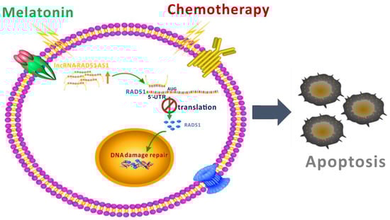 DNA repair mechanisms are activated when cells undergo DNA damage, and apoptosis occurs if the DNA cannot be repaired. Nevertheless, most tumor cells accumulate mutations in their DNA repair proteins, resulting in hyperactive DNA repair [30,31,32,33]; even if these cells are damaged by chemotherapeutic drugs, apoptosis will not be invoked [34,35]. This phenomenon is one of the reasons for the resistance of cancer cells to chemotherapy. Therefore, understanding the mechanisms by which cancer cells activate DNA repair and blocking this process are an effective strategy for increasing the therapeutic effectiveness of chemotherapy [36,37,38,39]. In this study, we used cellular and animal model experiments to demonstrate that melatonin can increase the sensitivity of HCC cells to chemotherapy and radiotherapy. Melatonin reduced RAD51 protein expression through lncRNA RAD51-AS1 and decreased DNA damage repair capacity, resulting in an inability to repair DNA damage caused by chemotherapy and radiotherapy and thereby enhancing cell death (Figure 7). To the best of our knowledge, our study is the first to show that melatonin can regulate the lncRNA RAD51-AS1 and thus control a DNA damage repair mechanism.