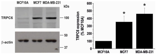 Consistent with the previous study by Aydar and coworkers [31], Western blot analysis of whole cell lysates from the non-tumoral breast MCF10A cell line, the ER+ and triple negative breast cancer cell lines MCF7 and MDA-MB-231, respectively, with a specific anti-human TRPC6 antibody revealed that the expression of this protein is relatively low in the non-tumoral cell line (Figure 1). Furthermore, TRPC6 expression in the MCF7 and MDA-MB-231 cell lines is significantly greater (approximately 350 and 460%, respectively) than in non-tumoral cells. TRPC6 expression in the different cell lines, normalized to the β-actin content and expressed as percentage of the expression level in MCF10A, is shown in Figure 1 (bar graphs; n = 6).