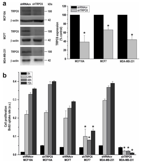 As shown in Figure 2a, cell transfection with shTRPC6 significantly attenuated TRPC6 expression in MCF10A, MCF7 and MDA-MB-231 cells (p < 0.05; n = 6). Next, we explored the effect of transfection with shTRPC6 in cell proliferation in the three cell lines. Forty-eight hours after transfection (time = 0 h), as well as 24, 48 and 72 h later, cell proliferation was assessed. As expected, the shTRPC6 was without effect in MCF10A proliferation, which is consistent with the low native TRPC6 expression and indicates a lack of effect of shTRPC6 in cell proliferation in this cell line (Figure 2b; n = 6). Interestingly, silencing TRPC6 protein expression significantly attenuated MCF7 and MDA-MB-231 cell proliferation at all the times investigated as compared to cells transfected with shRNAcv (Figure 2b; p < 0.05; n = 4). Therefore, our observations reveal that TRPC6 is essential for ER+ and triple negative breast cancer cell proliferation.