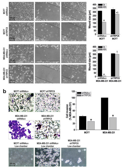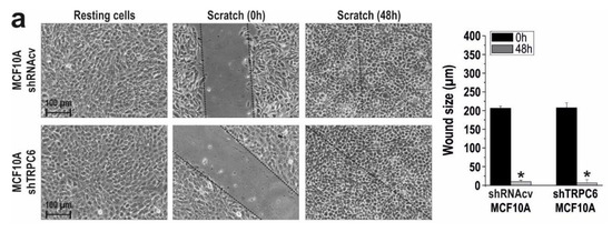 Next, we assessed the relevance of TRPC6 in the ability of these cell lines to migrate. MCF10A, MCF7 and MDA-MB-231 cells were subjected to the well-established wound healing assay. Cells were seeded, scratched, and cultured in medium supplemented with 1% serum to prevent further cell growth. Migration of cells was quantitated as described in Materials and Methods. To explore the role of TRPC6 in cell migration MCF10A, MCF7 and MDA-MB-231 cells were transfected with shTRPC6 or control plasmid and cell migration was evaluated. As shown in Figure 3a, MCF10A, MCF7 and MDA-MB-231 cells transfected with shRNAcv significantly reduced the wound size during the first 48 h (p < 0.05; n = 3). TRPC6 expression silencing did not affect the ability of MCF10A to migrate (Figure 3a; n = 3), which is consistent with the low expression of TRPC6 in this cell line. Interestingly, silencing TRPC6 expression significantly attenuated MCF7 and MDA-MB-231 migration as compared to cells transfected with shRNAcv (Figure 3a; p < 0.05; n = 3), which indicates that TRPC6 plays an important role in MCF7 and MDA-MB-231 cell migration.