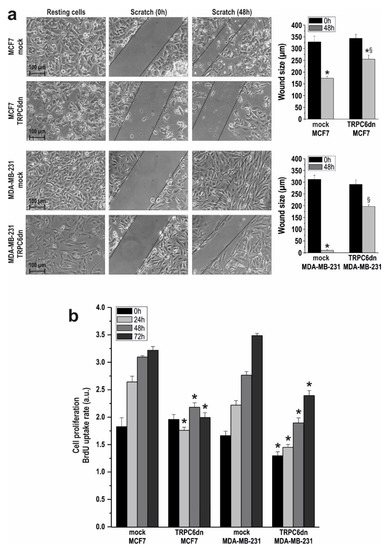 Furthermore, expression of the TRPC6dn mutant significantly attenuated MCF7 and MDA-MB-231 cell proliferation at all the times investigated as compared to cells transfected with empty vector (Figure 4b; p < 0.05; n = 3). These findings confirm that TRPC6 is required for MCF7 and MDA-MB-231 breast cancer cells migration and proliferation.