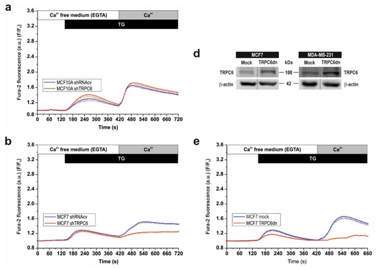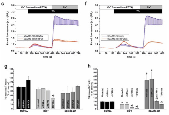 As our results indicate that TRPC6 knockdown significantly attenuates relevant features of cancer cells, such as proliferation, migration and in vitro invasion, we have explored the possible mechanism underlying the functional role of TRPC6 in these cells. SOCE has been reported to play an important role supporting several cancer hallmarks [16,33,34]. Hence, we have evaluated whether TRPC6 plays a role in the activation of SOCE in breast cancer cells by transfecting non-tumoral MCF10A and cancer MCF7 and MDA-MB-231 cells with shTRPC6 or shRNAcv, as control. As depicted in Figure 5a–c, in cells transfected with shRNAcv suspended in a Ca2+-free medium, treatment with the SERCA inhibitor TG (1 µM) resulted in a transient increase in cytosolic free-Ca2+ concentration due to Ca2+ release from the intracellular Ca2+ stores. Subsequent addition of CaCl2 (1 mM) to the extracellular medium resulted in a further increase in cytosolic free-Ca2+ concentration indicative of SOCE. TG-induced Ca2+ release was similar in all the cell lines investigated while Ca2+ influx was significantly greater in MDA-MB-231 cells (Figure 5g,h; p < 0.05; n = 40 cells/day/3–5 days). Attenuation of TRPC6 expression by cell transfection with shTRPC6 significantly inhibited SOCE in MCF7 and MDA-MB-231 cells by 70%, without having any effect on Ca2+ release from the intracellular stores (Figure 5a–c,g–h; p < 0.05). Transfection of MCF10A cells with shTRPC6 did not significantly alter TG-induced Ca2+ release or entry, which is consistent with the low TRPC6 expression at the protein level in these cells. Altogether these findings indicate that TRPC6 plays a relevant role in the activation of SOCE in MCF7 and MDA-MB-231 breast cancer cells while this protein has not a detectable role in non-tumoral MCF10A cells.