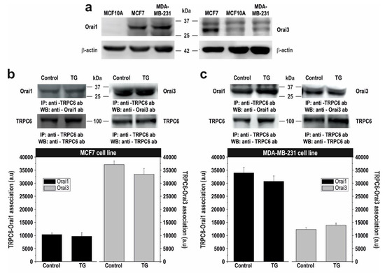Breast cancer MCF7 and MDA-MB-231 cells have been reported to express both Orai1 and Orai3 channels. However, the relative expression level and function differs from ER+ MCF7 cells to triple negative MDA-MB-231 cells [35]. While SOCE in MDA-MB-231 cells entirely depends on Orai1, MCF7 SOCE is mainly mediated by Orai3, whose expression, regulated by ERα [17], is predominant over that of Orai1 [35]. Our results confirm that Orai1 is overexpressed in the breast cancer cell lines and that Orai3 expression is significantly enhanced in MCF7 (Figure 6a; p < 0.05; n = 6), as previously reported [35]. In order to explore the mechanism underlying the sensitivity of SOCE to TRPC6 expression and function we have first investigated the interaction of TRPC6 with Orai1 and Orai3 by co-immunoprecipitation from MCF7 and MDA-MB-231 cell lysates. Resting and TG-treated cells were used for this study to determine whether Ca2+ store depletion plays any role in the possible interaction between TRPC6 and the Orai proteins investigated. As shown in Figure 6b,c, immunoprecipitation of cell lysates with anti-TRPC6 antibody followed by Western blotting with anti-Orai1 or anti-Orai3 antibody reveals that TRPC6 interacts with both proteins in resting cells. Interestingly, our results suggest that in MCF7 cells the interaction of TRPC6 with Orai3 is apparently greater than with Orai1, and, conversely, in MDA-MB-231 cells, TRPC6 seems to interact predominantly with Orai1 over Orai3 (Figure 6b,c; n = 6). Although these apparent differences might be attributed to the use of two different antibodies, if we look at the association of TRPC6 with Orai1, whose expression we and others have found to be similar in MCF7 and MDA-MB-231 cells [35] (Figure 6a), and we normalize the data with the amount of TRPC6 pulled down, our results indicate that more Orai1 is bound to TRPC6 in MDA-MB-231 cells (p < 0.05; n = 6). In addition, we have found that the interaction of TRPC6 with Orai1 and Orai3 is not altered by treatment with 1 µM TG for 3 min (Figure 6b,c), which, as depicted in Figure 5, is able to induce significant store depletion.