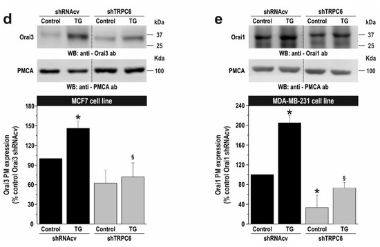 Orai1 and Orai3 have been reported to account for most of the Ca2+ influx during the activation of SOCE in MDA-MB-231 and MCF7 cells, respectively [35], and our results indicate that TRPC6 knockdown results in similar attenuation of Ca2+ influx to that previously reported after Orai1 and Orai3 knockdown [35]. Hence, it is quite unlikely that TRPC6 and either Orai1 or Orai3 operate in separate pathways. A possible explanation for SOCE dependency on TRPC6 channel is that attenuation of TRPC6 expression reduces the plasma membrane localization of Orai1 and Orai3 in MDA-MB-231 and MCF7, respectively, where these channels have been found to be essential for SOCE [17,33,35]. Thus, we analysed the plasma membrane localization of Orai1 in MDA-MB-231 cells and Orai3 in MCF7 cells in cells transfected with shTRPC6 or shRNAcv, as control, by surface biotinylation. As shown in Figure 6d,e, surface exposition of Orai3 and Orai1 was clearly detected in MCF7 and MDA-MB-231 cells transfected with shRNAcv, respectively, and the presence of both channels in the plasma membrane was significantly enhanced upon treatment with TG (p < 0.05; n = 6). Interestingly, silencing TRPC6 expression significantly attenuated resting and TG-stimulated Orai3 and Orai1 surface exposition in MCF7 and MDA-MB-231 cells, respectively (Figure 6d,e; p < 0.05; n = 6). By contrast, TRPC6 knockdown was without effect on the surface exposition of Orai1 in MCF7 and Orai3 in MDA-MB-231 cells (Figure S3). To exclude that the attenuated protein expression is attributed to a reduced overall expression we analysed the total amount of Orai1 and Orai3 in lysates of cells transfected with shTRPC6 or scramble plasmids. Our results indicate that silencing TRPC6 expression did not alter the expression of Orai1 or Orai3 proteins (Figure S4). Together, these findings suggest that TRPC6 is required for the plasma membrane localization of Orai1 and Orai3 in MDA-MB-231 and MCF7 cells, respectively.