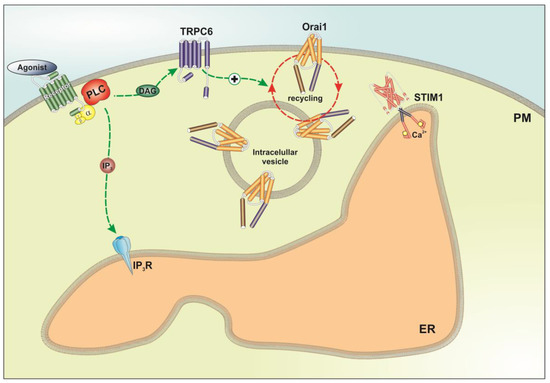 Proposed mechanism for the modulation of plasma membrane localization of Orai1 in MDA-MB-231 by TRPC6. Stimulation of MDA-MB-231 cells with Ca2+ mobilizing agonists might lead to phospholipase C (PLC) activation, which, in turn, results in the generation of IP3 and diacylglycerol (DAG). IP3 induces Ca2+ release from the ER while DAG results in the activation of TRPC6 channels (here only represented in the plasma membrane (PM) for simplicity). Ion influx via TRPC6 is required for the plasma membrane localization of Orai1, which, upon interaction with the ER Ca2+ sensor STIM1 participates in the activation and maintenance of SOCE in these cells. This molecular signalplex might play a functional role with relevance in cell proliferation and migration.
