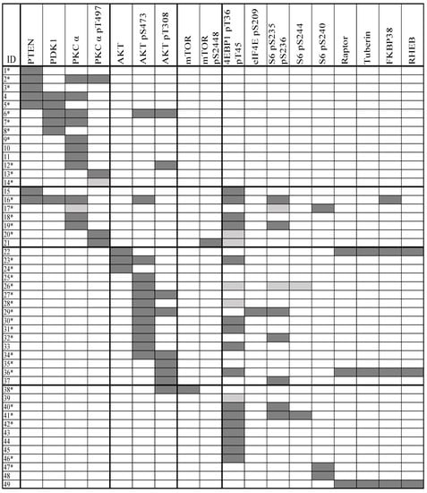 Taken together, the observations described above show that 49 out of 114 patients with clonal heterogeneity differ with regard to how the heterogeneity is reflected in the PI3K-Akt-mTOR expression/phosphorylation profile.