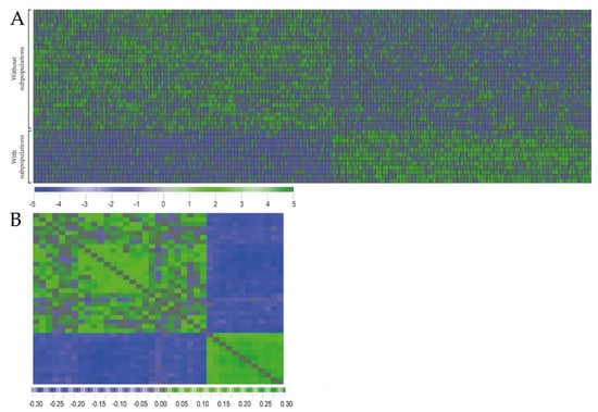 We compared the global gene expression profiles for 12 AML samples with and 27 samples without dual AML cell populations. A feature subset selection (FSS) analysis was performed for identification of the most discriminative genes between the two groups, and 1209 genes were then identified (i.e., p-value <0.05, see the complete gene list is included in Table S5 and Table S6). This criterion was chosen because AML is a highly heterogeneous disease with regard to differentiation, karyotype and molecular genetics [1,2,3]; and this can be seen from the characteristics of our present patient cohort (Table 1 and Table 2 below, Table S1). For this reason, a relatively large number of differentially expressed genes will probably be needed to distinguish between patient subsets. The identified genes were used in a hierarchical clustering model (Pearson’s correlation distance measure with complete linkage; and this analysis identified two main patient subsets that corresponded to the patients with and without subpopulations. Furthermore, a correlation visualization with distance matrix displays the pairwise correlation between the 39 patients and the classification of patients into two main subsets corresponding to the subsets with and without subclones, respectively (Figure 2).