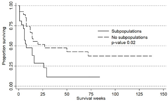 In a recent study, karyotyping could detect clonal heterogeneity for approximately 15% of patients, and this heterogeneity was then associated with an adverse prognosis in patients receiving intensive AML therapy [9]. We therefore investigated whether detection of subclones determined by analysis of constitutive PI3K-Akt-mTOR activation had a similar prognostic association. In our present study, we investigated a large group of unselected patients that included several elderly and unfit patients who could not receive intensive treatment [12]. However, 44 of our patients completed their planned intensive induction treatment followed by at least two consolidation cycles, autologous or allogeneic stem cell transplantation after their first diagnosis of AML. We compared the survival of 17 patients with and 27 patients without subpopulations; the overall survival was significantly higher for patients without subpopulations (Figure 3; p = 0.027). This association between prognosis and heterogeneity was significant both in crude (Table 1, Cox Proportional Hazard Model, p = 0.03) and adjusted analyses (p = 0.04). To summarize, the previous study [9] showed that detection of clonal heterogeneity in patients with abnormal karyotype had an adverse prognostic impact. In our present study we used an alternative methodological strategy for detection of subclones independent of the karyotype (i.e., also including patients with normal karyotype), and we could detect an association between clonal heterogeneity and adverse prognosis.