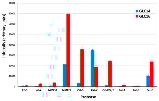 For all of the following experiments, only the significantly expressed proteases out of the 35 enzymes assayed are shown. GLC14 and GLC16 represent lines established from metastases of the same patient before and after failure of chemoradiotherapy, respectively. Results demonstrate that during the progressive disease, GLC16 showed elevated expression of most proteases, with marked overexpression of MMP-9, cathepsins S, X/Z/P and D, as well as partial downregulation of cathepsin V (Figure 1).