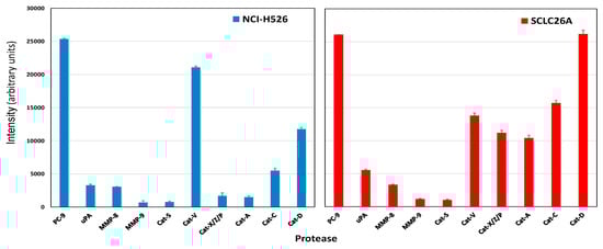 Figure 2. The figure shows selected proteases expressed by NCI-H526 (left side) and SCLC26A (right side) SCLC cell lines, established from a bone metastasis and from pleural effusion, respectively. Values represent mean ± SD.