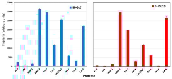 Figure 3. Selected proteases expressed by BHGc7 (left side) and BHGc10 (right side) SCLC CTC lines, established from blood samples of two refractory SCLC patients, respectively. Values represent mean ± SD.