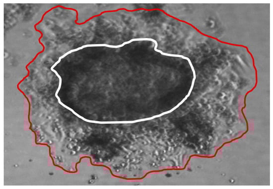Figure 5. Light microscopic picture of a SCLC tumorosphere embedded in extracellular matrix (ECM) showing invasive outgrowth of cancer cells. The white line indicates the contour of the original spheroid at beginning (magnification 40×).