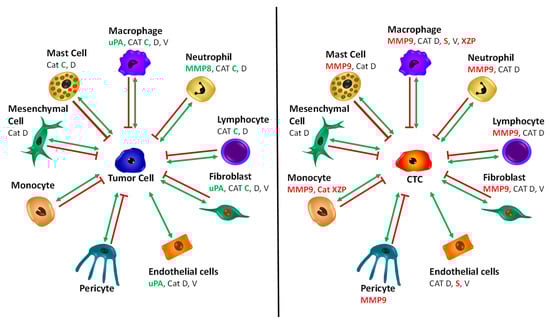 Figure 6 depicts the MMP and cathepsin proteases involved in tumor cell and CTC interactions with normal cell types. Proteases occurring in tumor cell interactions are shown in green color, and those in CTC interactions in red color. For CTCs, the specific proteases comprise MMP9, Cathepsin S, and cathepsin X/Z/P. Cathepsin C is involved in tumor interactions with mast cells, lymphocytes, fibroblasts and macrophages, and uPA with fibroblasts and endothelial cells, respectively. Additionally, MMP-8 functions in relation to neutrophils. In the case of CTCs, the cells interact with all normal cell types, except mesenchymal cells via one or more of the proteases specifically expressed.