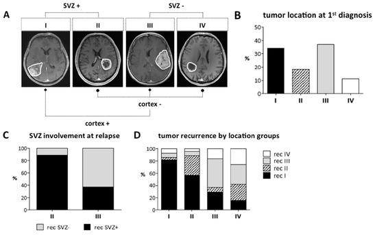 Mounting evidence suggests that glioma ontogeny is linked to a subpopulation of neural stem (NSC) and progenitor (NPC) cells persisting in neurogenic niches throughout adulthood, in particular NSC-like astrocytes in the subventricular zone (SVZ) lining the walls of the lateral ventricles [3,4]. In animal models, inactivation of tumor suppressor genes (TP53, NF1, PTEN) or activation of oncogenes (Akt, Ras) resulted in the formation of astrocytomas through malignant transformation of NSCs [5,6,7,8]. In humans, the SVZ was identified as a reservoir of malignant precursor clones by employing a novel approach of intraoperative fluorescence-guided multiple sampling of GBMs and their adjacent fluorescent SVZ [9]. Accordingly, targeting the ipsilateral SVZ by postoperative irradiation has been shown to confer improved progression-free (PFS) and overall (OS) survival [10]. Ultimately, several studies have reported that the proximity of GBM to the SVZ is associated with inferior patient outcomes [11,12,13,14,15,16]. However, none of these studies considered isocitrate dehydrogenase 1 (IDH1) mutation status for survival analysis, although IDH1-mutant (IDH1-mut) gliomas comprise a molecularly distinct GBM subgroup with favorable patient outcomes [17,18]. This has prompted the 2016 WHO classification of CNS tumors to discriminate between IDH1-wildtype (IDH1-wt) and IDH1-mut GBMs [19]. Moreover, conflicting data exist regarding the impact of SVZ involvement on growth and recurrence patterns of GBM. Initially, Lim et al. reported a series of 53 GBMs assigned to four groups dependent on their spatial relationship to the SVZ and the cortex [20]. Group I GBMs (contacting SVZ and cortex) were most frequently multifocal at the first diagnosis and recurred in a remote location, while group IV GBMs (neither contacting SVZ nor cortex) were always solitary lesions with tumor recurrence exclusively adjacent to the resection cavity [20]. Accordingly, Adeberg et al. reported that distant and multifocal progression was more common in GBMs contacting the SVZ [21]. In contrast, Kappadakunnel et al. found the highest rate of multifocal disease in group III GBMs (involving cortex but not SVZ), while the presence of distant tumor recurrence was independent of tumor location [12]. Intriguingly, in a MRI analysis of 49 GBM patients, no location-dependent recurrence pattern was observed [22]. Finally, computerized simulation of glioma growth provided evidence that GBMs involving the SVZ do not necessarily originate in the periventricular region, but also in the white matter with centrifugal growth and ultimate contact to the SVZ, dependent on increasing tumor size [23]. To shed light into these conflicting data, possibly owing to small sample sizes and the inherent molecular bias conferred by IDH1 mutations, we sought to analyze a large cohort of 285 patients with newly diagnosed IDH1-wt GBM with respect to location-dependent survival, growth, and recurrence patterns.