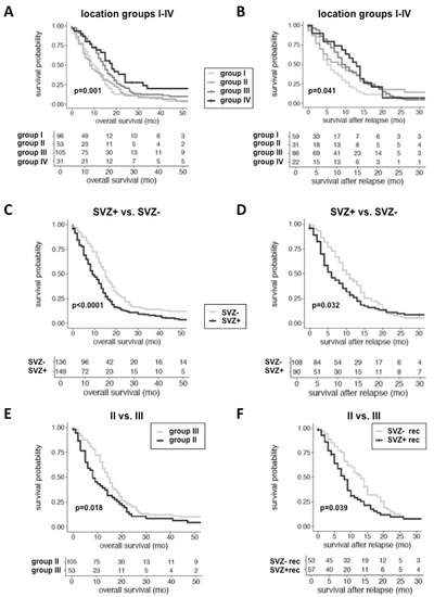Kaplan-Meier plots depicting the negative prognostic impact of SVZ involvement in 285 IDH1-wt GBM patients; numbers at risk are given. OS and survival after relapse, but not PFS differed significantly when comparing all location groups (A,B), SVZ+ vs. SVZ− GBMs (C,D) and group II vs. group III GBMs (n = 155) (E,F). Shortest median OS and survival after relapse were observed in group I (10 and 5 months) and group II (8 and 6 months) patients. For comparison of survival after relapse in group II vs. group III GBMs, SVZ involvement at recurrence (SVZ+/− rec) was valued.