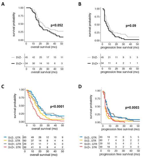 When analyzing IDH1-wt GBM patients with intensified adjuvant treatment (i.e., completion of concomitant radio-chemotherapy and ≥ 3 cycles of TMZ-based chemotherapy) only (n = 79), absence of radiographic SVZ involvement conferred a non-significant, but meaningful prolongation of OS (24 vs. 18 months; A) and PFS (9 vs. 6 months; B) that also compared favorable to the outcomes of the most recent “historic control” derived from a multicenter trial on tumor-treating fields in newly diagnosed GBM [36] (OS = 16 months; PFS = 4 months; data not shown). (C,D) Kaplan-Meier plots depicting the prognostic significance of SVZ involvement in 285 IDH1-wt GBM patients on OS (C) and PFS (D) when stratified for EOR. Noteworthy, the negative prognostic impact of SVZ involvement can be, in part, resolved by GTR since OS and PFS were comparable in patients undergoing GTR regardless of SVZ involvement (OS: SVZ+GBM 15.5 months vs. SVZ−GBM = 16.5 months; PFS: SVZ+GBM 6.5 months vs. SVZ−GBM 6 months). A tabular overview of numbers at risk is given below each Kaplan-Meier plot.