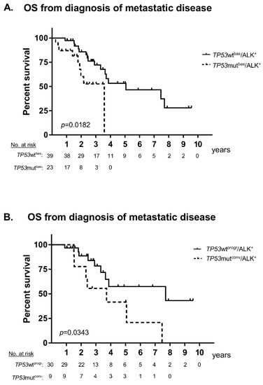 The results presented here extend the findings of recent studies that demonstrated the major clinical significance of baseline TP53 mutational status in ALK+ NSCLC [6,7,8] As in a previous report [8], presence of TP53 mutations in our patients at initial diagnosis was associated with shorter PFS under TKI (Figure 2B) and worse OS (Figure 1A), but did not apparently affect benefit from chemotherapy (Supplementary Figure S1).
