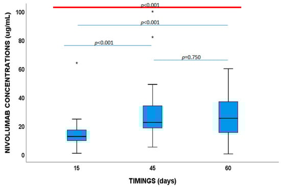 Nivolumab plasma concentrations at 15, 45 and 60 days.